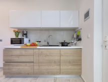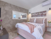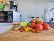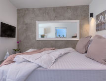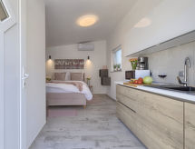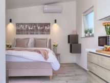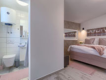 1 -sobna kuća 20 m2. Lijepo uređena: dnevno-spavaća soba s 1 franc. krevetom (140 cm, dužina 200 cm), stolom za blagovanje i TV-om sa sat. prijemnikom (plosnatim TV ekranom), klima uređajem. Izlaz na terasu. Otvorena kuhinja (2 staklokeramičke ploče za kuhanje, mikrovalna pećnica, zamrzivač, el. aparat za kavu). Tuš/WC. Terasa 8 m2. Garnitura za sjedenje. Na raspolaganju: sef, glačalo, dječji krevetić, sušilo za kosu. Internet (wireless LAN [WLAN], besplatan). Parking (1 automobil). 1 kućni ljubimac / pas dozvoljen.- postrojenja