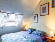 "Ty-Rozen (LOQ219)", 3 -sobna polovica dvojne kuće 40 m2 na 2 etaže. Objekt pogodan za 2 odraslih + 1 dijete. Svrsishodno i udobno uređena: kuhinja/dn. boravak (perilica za suđe, 4 staklokeramičke ploče za kuhanje, toster, kuhalo za vodu, el. aparat za kavu, kombinirana mikrovalna pećnica) s stolom za blagovanje i TV-om sa sat. prijemnikom. Izlaz na terasu. Tuš/WC. El. grijanje. Gornji kat: s kosim stropom prolazna soba s krovnim prozorom s 1 franc. krevetom (160 cm). 1 otvorena soba s kosim stropom s krovnim prozorom s 1 krevetom. Mala terasa. Garnitura za sjedenje, vrtni roštilj (prijenosni), ležaljke (2), mjesto za sjedenje. Na raspolaganju: perilica za rublje, visoka dječja stolica. Internet (wireless LAN [WLAN], besplatan). Dodatna informacija: apartman za nepušače. 1 kućni ljubimac / pas dozvoljen. Protupožarni alarm. Zasebne stambene jedinice nisu interno povezane.- postrojenja