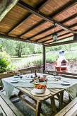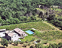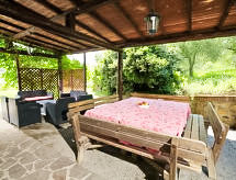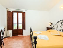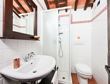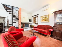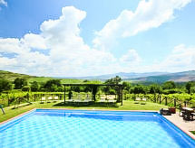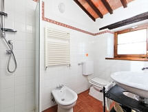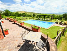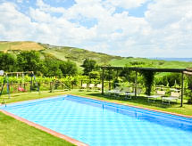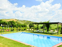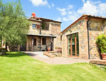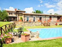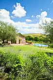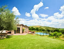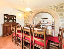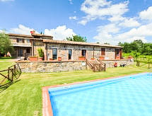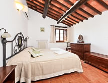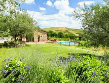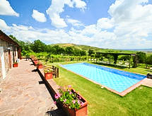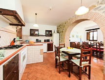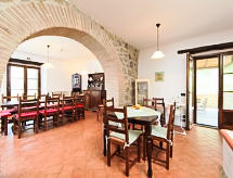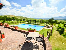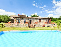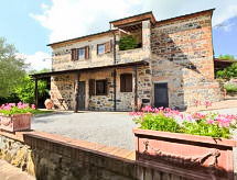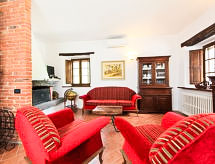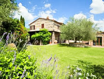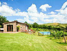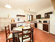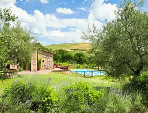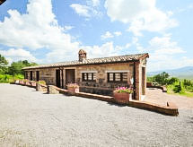 Ladanjska kuća "Val d'Orcia", 580 m n.m., zasebna, okružena poljima i vinogradima. Ispod mjesta Radicofani, sunčano mjesto na brežuljku, u zelenom. Za samostalno korištenje: parcela 1 ha (ograđena), terasasti vrt, 300 m2 - cvijeće, bazen zaklonjen od pogleda (6 x 12 m, 120- 150 cm dubok, sezonska dostupnost: 01.May. - 15.Oct.). Tuš/WC uz bazen, stolni tenis, mjesto za sjedenje, pergola (40 m2), vrtna garnitura za sjedenje, roštilj (tobogan, ljuljačka). U kući: pristup internetu, hidromasažni bazen, prostorija za relaksaciju, klimatizacija, alarmni sustav, perilica za rublje, najam bicikli. Kuhar moguć. Parking na parceli. Trgovina živežnim namirnicama 3 km, restoran 3 km, termalno kupalište "Bagni di San Filippo" 12 km. U blizini: San Casciano Dei Bagni 20 km, Vivo D'orcia 20 km, Bagno Vignogni 28 km, Castiglion D'orcia 30 km, San Quirico D'orcia 31 km, Pienza 35 km. Dodatna informacija: preporučljiv vlastiti prijevoz. Prikladno za obitelji, oprema za bebe na upit. Residence s električnom kapijom.Interior