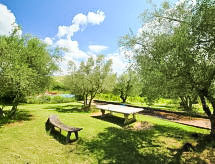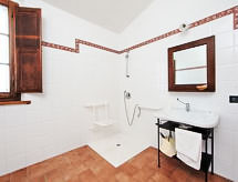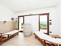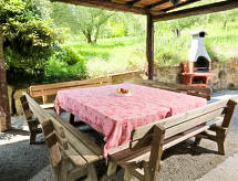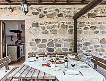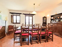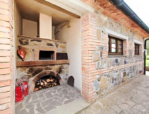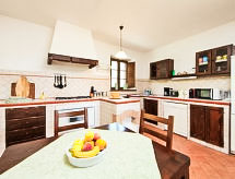7 -sobna kuća 300 m2 na 2 etaže. Prostrano, komforno i rustikalno uređena: dnevni boravak s otvorenim kaminom i TV-om sa sat. prijemnikom. Izlaz u vrt. Velika blagovaona. Izlaz u vrt. 1 soba s 1 kaučem za 1 osobu, 1 bračnim krevetom, tušem/bidetom/WC-om, TV-om sa sat. prijemnikom i plosnatim TV ekranom. Izlaz u vrt. 1 mala soba s 1 bračnim krevetom i tušem/bidetom/WC-om. Izlaz u vrt. Otvorena kuhinja (5 pećnica, perilica za suđe, 1 Indukcione ploče, mikrovalna pećnica, zamrzivač, el. aparat za kavu, Doze za mašinu za kavu (Lavazza)). Izlaz u vrt, pergola. Odv. WC. Grijanje na plin, klima uređaj. Grijanje na raspolaganju samo od 01.11. do 15.04. Gornji kat: (kružne stepenice) 1 soba s 2 kreveta i tušem/bidetom/WC-om. 2 bračne sobe, svaka soba s tušem/bidetom/WC-om. (vanjske stepenice) predsoblje. Izlaz u vrt, na lođu. Komforno uređeno u ladanjskom stilu. Vrt. Garnitura za sjedenje, vrtni roštilj. Na raspolaganju: perilica za rublje, mrežice protiv komaraca, visoka dječja stolica, sušilo za kosu, drvo (uklj.). Internet (wireless LAN [WLAN], besplatan). IPod docking station. 1 kućni ljubimac / pas dozvoljen.- postrojenja