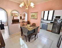 3 -sobni apartman 80 m2 na 1. katu. Svijetlo, svrsishodno i komforno uređen: otvoreni veliki dnevni boravak/blagovaona s 1 rasklopnim ormar-krevetom za 1 osobu (80 cm, dužina 190 cm), stolom za blagovanje i TV-om. Izlaz na balkon. Povezna soba s 2 kreveta. 1 velika bračna soba. Otvorena kuhinja (pećnica, perilica za suđe, 4 plamena za kuhanje, toster, kuhalo za vodu, mikrovalna pećnica, zamrzivač). Kada/bidet/WC. Grijanje. Balkonski namještaj, lođa, ostava. Pogled. Na raspolaganju: perilica za rublje, glačalo, sušilo za kosu. Internet (wireless LAN [WLAN], besplatan). IP0270420980- postrojenja