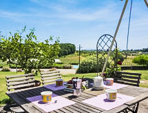 "Vanessa", 3 -sobna polovica dvojne kuće 110 m2 na 2 etaže, u prizemlju. Veliki dnevni boravak s 2 ležaja, otvorenim kaminom i TV-om sa sat. prijemnikom. Kuhinja (pećnica, perilica za suđe, 4 staklokeramičke ploče za kuhanje, toster, kuhalo za vodu, zamrzivač). Tuš/bidet/WC. Gornji kat: 1 bračna soba. 1 soba s 2 kreveta. Tuš/bidet/WC. Terasa. Garnitura za sjedenje. Na raspolaganju: visoka dječja stolica, dječji krevetić do 2 godine, sušilo za kosu. Internet (wireless LAN [WLAN], besplatan). 1 kućni ljubimac / pas dozvoljen.- postrojenja