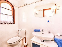 "Venecia", 4 -sobna kuća 130 m2 na 2 etaže. Komforno i udobno uređena: dnevni boravak/blagovaona s TV-om sa sat. prijemnikom (plosnatim TV ekranom). Izlaz na lođu. Otvorena kuhinja (pećnica, perilica za suđe, 4 staklokeramičke ploče za kuhanje, toster, kuhalo za vodu, mikrovalna pećnica, zamrzivač, el. aparat za kavu). Izlaz na lođu. Odv. WC. Bez grijanja. Gornji kat: 1 soba s 2 kreveta (105 cm, dužina 190 cm), tušem/bidetom/WC-om. 1 soba s 2 kreveta (90 cm, dužina 190 cm). 1 soba s 2 kreveta (105 cm, dužina 190 cm). Tuš/WC. Pogled na planine i krajolik. Na raspolaganju: perilica za rublje. Internet (wireless LAN [WLAN], besplatan). Dodatna informacija: kuća za nepušače. HUTG-028713- postrojenja