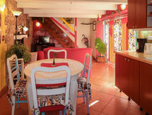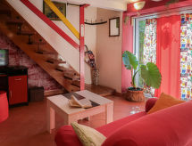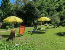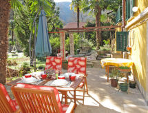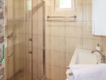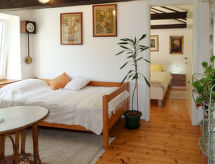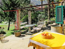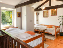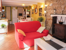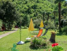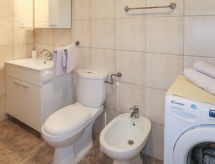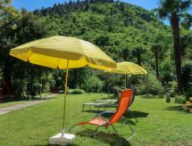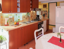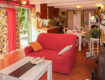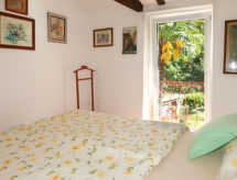 2 -sobna polovica dvojne kuće 70 m2 na 2 etaže. Dnevni boravak/blagovaona s kabelskom TV i međunarodnim TV kanalima (plosnatim TV ekranom), radiom i CD-om. Otvorena kuhinja (4 ploče za kuhanje, pećnica, perilica za suđe, mikrovalna pećnica, zamrzivač, el. aparat za kavu). Tuš/WC. Gornji kat: otvorena galerija s 2 kreveta (90 cm, dužina 190 cm). 1 soba s 1 franc. krevetom. Klima uređaj (uz doplatu). Vrtni roštilj (prijenosni), ležaljke. Pogled na planine. Na raspolaganju: perilica za rublje, glačalo. Internet (wireless LAN [WLAN], besplatan).- postrojenja