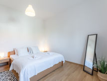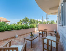 3 -sobni apartman 60 m2, u prizemlju, prema sjeveru. Dnevni boravak/blagovaona s 1 kaučem za 1 osobu (140 cm, dužina 190 cm), TV-om sa sat. prijemnikom i klima uređajem. Izlaz na terasu. 2 sobe, svaka soba s 1 bračnim krevetom (2 x 80 cm, dužina 190 cm). Otvorena kuhinja (4 ploče za kuhanje, pećnica, perilica za suđe, zamrzivač). Kada/WC. Terasa 30 m2 (djelomično natkrita). Garnitura za sjedenje. Na raspolaganju: Internet (wireless LAN [WLAN], besplatan).- postrojenja