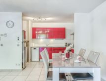 2 -sobni apartman 50 m2, u prizemlju. Dnevni boravak/blagovaona s 1 kaučem za 2 osobe (1 x 140 cm, dužina 190 cm), TV-om. Izlaz na terasu. 1 soba s 2 kreveta (90 cm, dužina 190 cm). Kuhinja (pećnica, perilica za suđe, 3 staklokeramičke ploče za kuhanje, kuhalo za vodu, mikrovalna pećnica, zamrzivač, el. aparat za kavu, Doze za mašinu za kavu (NESPRESSO) uz doplatu). Tuš, odv. WC. Klima uređaj. Velika terasa 16 m2. Garnitura za sjedenje. Na raspolaganju: perilica za rublje, glačalo, sušilo za kosu. Internet (wireless LAN [WLAN], besplatan). Parking br. 17 (1 automobil). Dodatna informacija: apartman za nepušače. TV samo FR. Protupožarni alarm.- postrojenja