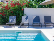 4 -sobna kuća 140 m2 na 2 etaže. Lijepo i ukusno uređena: dnevni boravak/blagovaona s TV-om sa sat. prijemnikom (plosnatim TV ekranom), klima uređajem. Izlaz na terasu, na bazen. Otvorena kuhinja (pećnica, perilica za suđe, 4 staklokeramičke ploče za kuhanje, kuhalo za vodu, zamrzivač, el. aparat za kavu). Tuš/WC. Gornji kat: 1 soba s 1 franc. krevetom (160 cm, dužina 200 cm), TV-om sa sat. prijemnikom (plosnatim TV ekranom), klima uređajem. Izlaz na terasu. 1 soba s 2 kreveta (90 cm, dužina 200 cm), klima uređajem. 1 soba s 1 franc. krevetom (160 cm, dužina 200 cm), TV-om sa sat. prijemnikom (plosnatim TV ekranom), klima uređajem. Tuš/WC. Terasa 25 m2 (natkrita), terasa 25 m2. Garnitura za sjedenje, vrtni roštilj (prijenosni), ležaljke. Pogled u daljini na more. Na raspolaganju: sef, mrežice protiv komaraca, sušilo za kosu.- postrojenja