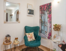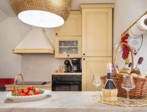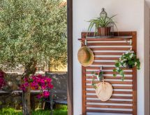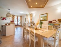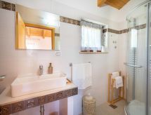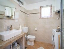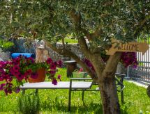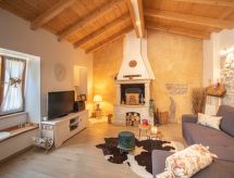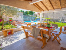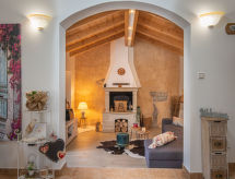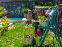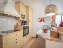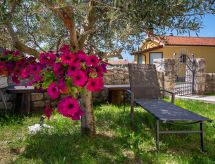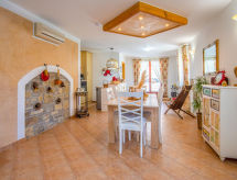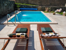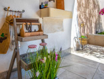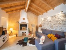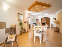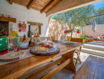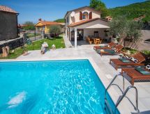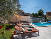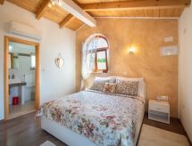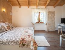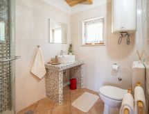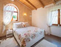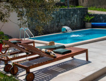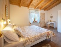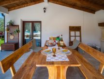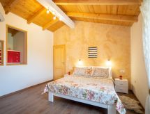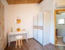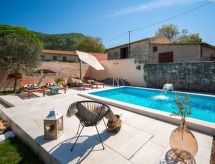 3 -sobna kuća 150 m2 na 2 etaže. Potpuno renovirana godine 2018: dnevni boravak/blagovaona 70 m2 s 1 kaučem za 2 osobe (140 cm, dužina 220 cm), otvorenim kaminom i TV-om sa sat. prijemnikom (plosnatim TV ekranom), klima uređajem. Izlaz na terasu. Otvorena kuhinja (pećnica, perilica za suđe, 4 staklokeramičke ploče za kuhanje, mikrovalna pećnica, zamrzivač, el. aparat za kavu). Tuš/WC. Grijanje na drva (uz doplatu). Gornji kat: 1 soba s 1 bračnim krevetom (2 x 80 cm, dužina 200 cm), tušem/WC-om i TV-om (plosnatim TV ekranom), klima uređajem. 1 soba s 1 bračnim krevetom (2 x 80 cm, dužina 200 cm), tušem/WC-om i klima uređajem. Grijanje toplim zrakom (uz doplatu). Terasa 25 m2 (natkrita). Garnitura za sjedenje, ležaljke. Pogled na bazen. Na raspolaganju: sef, glačalo, dječji krevetić, sušilo za kosu, drvo (uz doplatu). Internet (wireless LAN [WLAN], besplatan). Dodatna informacija: vatrogasni aparat.- postrojenja