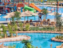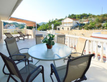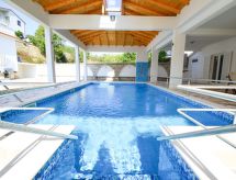 10 -sobna kuća 258 m2 na 3 etaže, prema zapadu. Dnevni boravak/blagovaona s 1 kaučem za 2 osobe (140 cm, dužina 190 cm), TV-om sa sat. prijemnikom (plosnatim TV ekranom), klima uređajem. Izlaz na terasu. 1 soba s 1 franc. krevetom (180 cm, dužina 200 cm). Izlaz na terasu. Otvorena kuhinja (1 ploča za kuhanje, pećnica, perilica za suđe, 3 plamena za kuhanje, zamrzivač, el. aparat za kavu). Tuš/WC. Gornji kat: (vanjske stepenice) dnevni boravak/blagovaona s TV-om sa sat. prijemnikom (plosnatim TV ekranom), klima uređajem. Izlaz na terasu. 1 soba s 1 franc. krevetom (180 cm, dužina 200 cm), klima uređajem. Izlaz na terasu. 1 soba s 1 franc. krevetom (160 cm, dužina 200 cm), tušem/WC-om i klima uređajem. Izlaz na terasu. 1 soba s 1 x 2 kreveta na kat (90 cm, dužina 190 cm), klima uređajem. Otvorena kuhinja (1 ploča za kuhanje, pećnica, perilica za suđe, 3 plamena za kuhanje, zamrzivač, el. aparat za kavu). Tuš/bidet/WC, odv. WC. Klima uređaj. 2. Gornji kat: (vanjske stepenice) dnevni boravak/blagovaona s TV-om sa sat. prijemnikom (plosnatim TV ekranom), klima uređajem. Izlaz na terasu. 2 sobe, svaka soba s 1 franc. krevetom (150 cm, dužina 200 cm), tušem/WC-om i klima uređajem. Izlaz na terasu. 1 soba s 1 franc. krevetom (180 cm, dužina 200 cm), tušem/WC-om i klima uređajem. Otvorena kuhinja (1 ploča za kuhanje, pećnica, perilica za suđe, 3 plamena za kuhanje, zamrzivač, el. aparat za kavu) s klima uređajem. Odv. WC. Grijanje toplim zrakom. 2 terase 55 m2 (natkrite), terasa 65 m2 (djelomično natkrita). Garnitura za sjedenje, ležaljke. Pogled na bazen. Na raspolaganju: sef, dječji krevetić, sušilo za kosu. Internet (wireless LAN [WLAN], besplatan).- postrojenja