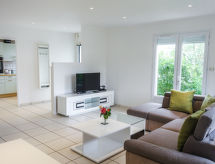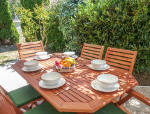 4 -sobna vila 97 m2. Svijetlo, moderno uređena: dnevni boravak/blagovaona s TV-om. Izlaz u vrt, na verandu. 2 sobe, svaka soba s 1 franc. krevetom (1 x 160 cm, dužina 190 cm). 1 soba s 2 kreveta (90 cm, dužina 190 cm). Kuhinja (pećnica, perilica za suđe, 4 staklokeramičke ploče za kuhanje, zamrzivač). Kada, odv. WC. El. grijanje. Vrt 350 m2. Garnitura za sjedenje. Na raspolaganju: perilica za rublje. Internet (wireless LAN [WLAN], besplatan). Parking (2 automobila). Dodatna informacija: protupožarni alarm.- postrojenja