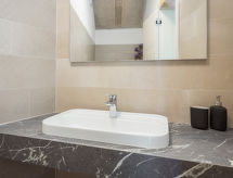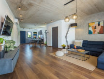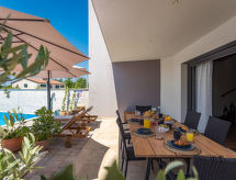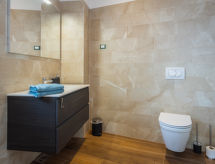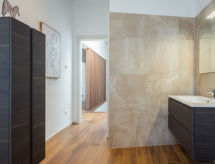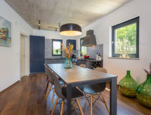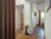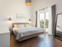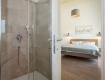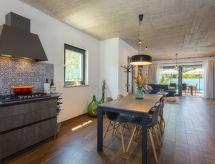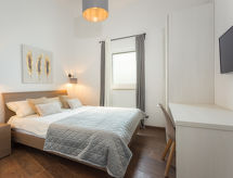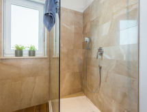 4 -sobna polovica dvojne kuće 140 m2 na 2 etaže. Moderno uređena: dnevni boravak/blagovaona s švedskom peći, TV-om sa sat. prijemnikom i klima uređajem. Izlaz na terasu. Otvorena kuhinja (pećnica, perilica za suđe, 5 plamena za kuhanje, toster, kuhalo za vodu, zamrzivač, el. aparat za kavu). Odv. WC. Gornji kat: 1 soba s 1 franc. krevetom (180 cm, dužina 200 cm), klima uređajem. Izlaz na balkon. 1 soba s 1 franc. krevetom (180 cm, dužina 200 cm), klima uređajem. 1 soba s 1 franc. krevetom (160 cm, dužina 200 cm), klima uređajem. Tuš/WC. Balkon, terasa 25 m2 (natkrita). Garnitura za sjedenje, vrtni roštilj, ležaljke, ostava. Na raspolaganju: sef, glačalo, mrežice protiv komaraca, visoka dječja stolica, dječji krevetić (uz doplatu), drvo (uklj.). Internet (wireless LAN [WLAN], besplatan). Dodatna informacija: kuća za nepušače. 1 kućni ljubimac / pas dozvoljen.- postrojenja