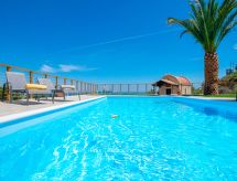 "Villa Lygaria", 4 -sobna vila 140 m2 na 2 etaže. Vrlo komforno i udobno uređena: dnevni boravak s TV-om sa sat. prijemnikom (plosnatim TV ekranom). Izlaz na verandu, pergola. Otvorena kuhinja (pećnica, perilica za suđe, 4 staklokeramičke ploče za kuhanje, mikrovalna pećnica, el. aparat za kavu) s stolom za blagovanje. Izlaz na verandu, pergola. Odv. WC. Klima uređaj. Gornji kat: 1 bračna soba s 1 bračnim krevetom. Izlaz na balkon. 1 bračna soba s 1 bračnim krevetom. 1 dječja soba s 1 krevetom. Kada/WC. Klima uređaj. Veliki balkon, mali balkon, velika vrtna terasa. Garnitura za sjedenje, balkonski namještaj. Panoramski pogled na more, vrt i krajolik. Na raspolaganju: perilica za rublje, sef, glačalo, sušilo za kosu. Internet (wireless LAN [WLAN], besplatan). 571352- postrojenja