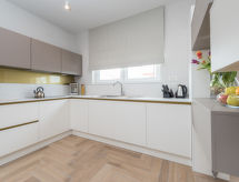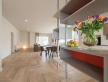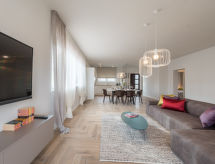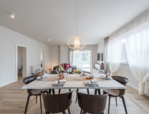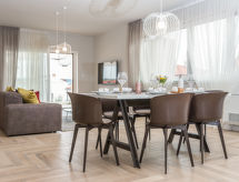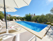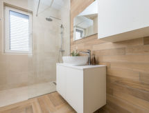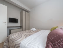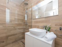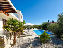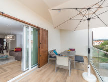4 -sobni apartman 120 m2 na 1. katu, prema jugozapadu. Dnevni boravak/blagovaona 70 m2 s TV-om sa sat. prijemnikom (plosnatim TV ekranom), klima uređajem. Izlaz na terasu. 1 soba s 1 franc. krevetom (160 cm, dužina 200 cm), tušem/WC-om i TV-om sa sat. prijemnikom (plosnatim TV ekranom), klima uređajem. 1 soba s 1 franc. krevetom (140 cm, dužina 200 cm), klima uređajem. 1 soba s 1 franc. krevetom (160 cm, dužina 200 cm), TV-om sa sat. prijemnikom (plosnatim TV ekranom), klima uređajem. Otvorena kuhinja (pećnica, perilica za suđe, 4 staklokeramičke ploče za kuhanje, mikrovalna pećnica, zamrzivač, el. aparat za kavu). Tuš/WC. Podno grijanje. Terasa 18 m2 (djelomično natkrita). Garnitura za sjedenje. Pogled na bazen. Na raspolaganju: perilica za rublje, sušilo za kosu. Internet (wireless LAN [WLAN], besplatan).- postrojenja