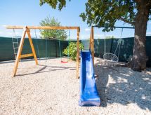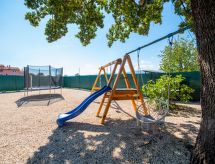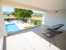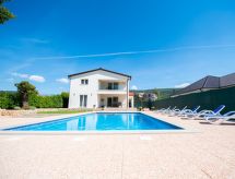 6 -sobna kuća 250 m2 na 2 etaže. Lijepo uređena: dnevni boravak/blagovaona 36 m2 s 1 kaučem za 2 osobe, kabelskom TV i međunarodnim TV kanalima (plosnatim TV ekranom), klima uređajem. Izlaz na terasu, na bazen. 1 soba s 1 franc. krevetom (160 cm, dužina 200 cm), klima uređajem. Izlaz na terasu, na bazen. 1 soba s 1 franc. krevetom (160 cm, dužina 200 cm), klima uređajem. Otvorena kuhinja (1 ploča za kuhanje, pećnica, perilica za suđe, 3 plamena za kuhanje, kuhalo za vodu, mikrovalna pećnica, zamrzivač, el. aparat za kavu). Tuš/WC, odv. WC. Gornji kat: 1 soba s 2 kreveta (90 cm, dužina 200 cm), klima uređajem. 1 soba s 1 franc. krevetom (160 cm, dužina 200 cm), kabelskom TV i međunarodnim TV kanalima (plosnatim TV ekranom), klima uređajem. Izlaz na terasu. 1 soba s 1 franc. krevetom (160 cm, dužina 200 cm), tušem/WC-om i klima uređajem. Tuš/WC. Terasa 18 m2, terasa 15 m2 (natkrita). Garnitura za sjedenje, ležaljke. Pogled na bazen. Na raspolaganju: sef, visoka dječja stolica, dječji krevetić, sušilo za kosu. Internet (wireless LAN [WLAN], besplatan). Dodatna informacija: vatrogasni aparat.- postrojenja