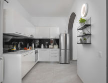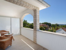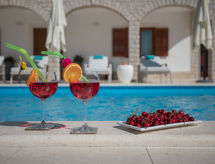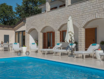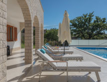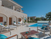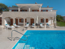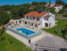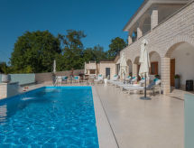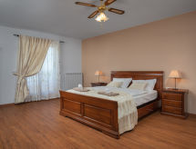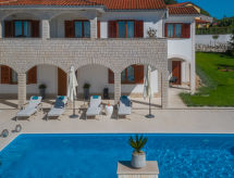 10 -sobna kuća 320 m2 na 2 etaže. Lijepo i ukusno uređena: dnevni boravak/blagovaona 30 m2 s kuhinjskim blokom i TV-om sa sat. prijemnikom (plosnatim TV ekranom), klima uređajem. Izlaz na terasu. 1 soba s 1 franc. krevetom (160 cm, dužina 200 cm), TV-om sa sat. prijemnikom (plosnatim TV ekranom), klima uređajem. Dnevni boravak/blagovaona 30 m2 s TV-om sa sat. prijemnikom (plosnatim TV ekranom), klima uređajem. Izlaz na bazen. 1 soba s 2 kreveta (90 cm, dužina 200 cm), TV-om sa sat. prijemnikom (plosnatim TV ekranom), klima uređajem. Otvorena kuhinja (pećnica, perilica za suđe, 4 staklokeramičke ploče za kuhanje, mikrovalna pećnica, zamrzivač, el. aparat za kavu). Tuš/WC, tuš/bidet/WC. Gornji kat: 3 sobe, svaka soba s 1 franc. krevetom (160 cm, dužina 200 cm), TV-om sa sat. prijemnikom (plosnatim TV ekranom), klima uređajem. 2 sobe, svaka soba s 1 franc. krevetom (160 cm, dužina 200 cm), tušem/WC-om i TV-om sa sat. prijemnikom (plosnatim TV ekranom), klima uređajem. Izlaz na terasu. 1 soba s 1 krevetom (90 cm, dužina 200 cm), TV-om sa sat. prijemnikom (plosnatim TV ekranom), klima uređajem. Izlaz na terasu. 2 x tuš/WC. Terasa 9 m2 (natkrita), 2 terase 14 m2. Garnitura za sjedenje, ležaljke. Pogled u daljini na more. Na raspolaganju: sef, glačalo, visoka dječja stolica, dječji krevetić, sušilo za kosu. Internet (wireless LAN [WLAN], besplatan).- postrojenja