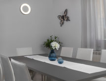 Lijepa obiteljska kuća "Villa Marina", na 2 kata, renovirana godine 2020. U zaseoku Mugeba 5 km od centra mjesta Poreč, mirno, sunčano mjesto, 3 km od mora, 3 km od plaže. Za samostalno korištenje: parcela 800 m2 (ograđena), vrt - travnjak i bilje, bazen pravokutni, grijani (10 x 4 m, 150 cm dubok, sezonska dostupnost: 01.Apr. - 15.Nov.). Tuš/WC uz bazen, vanjski tuš, kućica uz bazen s hladnjakom i štednjakom, vrtna garnitura za sjedenje, roštilj. U kući: pristup internetu, centralno grijanje, perilica za rublje. Parking (za 4 automobila) uz kuću na parceli. Trgovina 2 km, supermarket 5 km, restoran 2 km, šljunčana plaža 3 km, stjenovita plaža 3 km. Jahanje konja 3 km, pješačke staze od kuće 100 m, biciklistička staza 150 m. U blizini: aquapark 1.5 km, amusement park 5 km. Dodatna informacija: prikladno za obitelji. Vlasnik ne prihvaća grupe mladih. Susjedstvo izrazito osjetljivo na buku. Očekuje se mir i pristojno ponašanje. Bazen s protustrujnim plivanjem, hidromasažom i sa slapom. Potrebno je 7 dana unaprijed najaviti ukoliko se želi grijanje bazena. Video nadzor prilaza i parkinga. Organiziranje zabave nije dozvoljeno. Centralno grijanje dostupno samo u periodu 01.04.-30.04., 30.09.-30.11. (uz doplatu).Interior