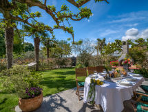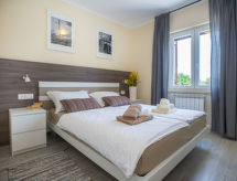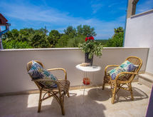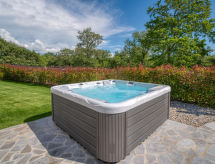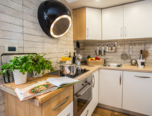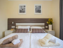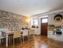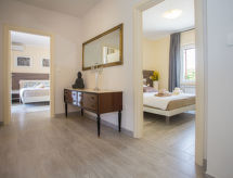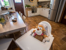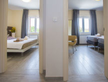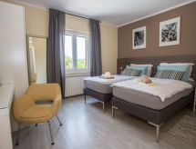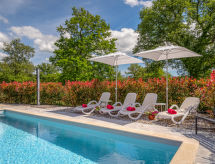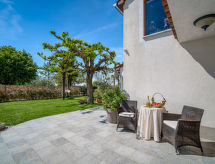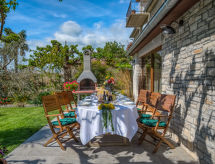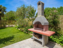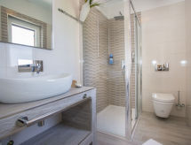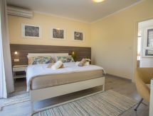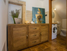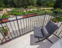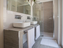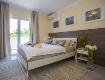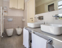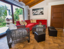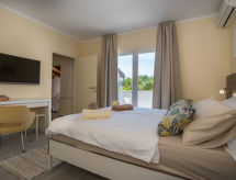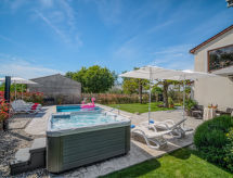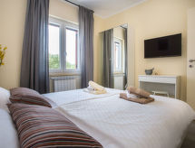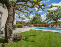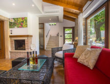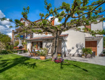 4 -sobna polovica dvojne kuće 120 m2 na 2 etaže. Potpuno renovirana godine 2018, komforno i ukusno uređena: dnevni boravak 25 m2 s otvorenim kaminom i TV-om sa sat. prijemnikom (plosnatim TV ekranom), klima uređajem. Izlaz na terasu. Blagovaona 25 m2. Otvorena kuhinja (pećnica, perilica za suđe, 4 staklokeramičke ploče za kuhanje, mikrovalna pećnica, zamrzivač, el. aparat za kavu). Odv. WC. Gornji kat: 1 soba s 1 franc. krevetom (160 cm, dužina 200 cm), tušem/bidetom/WC-om, duplim umivaonikom i TV-om sa sat. prijemnikom (plosnatim TV ekranom), klima uređajem. Izlaz na balkon, na terasu. 1 soba s 1 franc. krevetom (160 cm, dužina 200 cm), TV-om sa sat. prijemnikom (plosnatim TV ekranom), klima uređajem. 1 soba s 2 kreveta (90 cm, dužina 200 cm), TV-om sa sat. prijemnikom (plosnatim TV ekranom), klima uređajem. Tuš/WC. Balkon 5 m2, terasa 6 m2. Garnitura za sjedenje, ležaljke. Pogled na bazen i vrt. Na raspolaganju: sef, visoka dječja stolica, dječji krevetić, sušilo za kosu. Internet (wireless LAN [WLAN], besplatan).- postrojenja