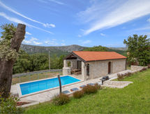 3 -sobna kuća 65 m2 na 2 etaže. Lijepo i udobno uređena: dnevni boravak/blagovaona 32 m2 s 1 kaučem za 2 osobe (150 cm, dužina 190 cm), kabelskom TV (plosnatim TV ekranom), klima uređajem. Izlaz na terasu, na bazen. Otvorena kuhinja (pećnica, perilica za suđe, 4 staklokeramičke ploče za kuhanje, zamrzivač, el. aparat za kavu). Grijanje toplim zrakom. Donji kat: (kružne stepenice) 2 sobe, svaka soba s 1 franc. krevetom (160 cm, dužina 190 cm), tušem/WC-om. Terasa 10 m2 (natkrita). Garnitura za sjedenje, vrtni roštilj (prijenosni), ležaljke. Pogled na bazen. Na raspolaganju: Internet (wireless LAN [WLAN], besplatan).- postrojenja