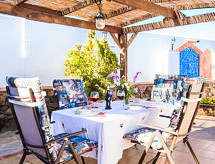 "Villa Miradri", 4 -sobna vila 110 m2. Komforno i ukusno uređena: dnevni boravak/blagovaona s otvorenim kaminom, TV-om i digitalnim TV. 1 soba s 1 bračnim krevetom (150 cm, dužina 190 cm). 1 soba s 2 kreveta (90 cm, dužina 190 cm). 1 soba s 2 kreveta (90 cm, dužina 190 cm). Otvorena kuhinja (perilica za suđe, 4 staklokeramičke ploče za kuhanje, mikrovalna pećnica, zamrzivač, el. aparat za kavu). Tuš/WC. Garnitura za sjedenje, vrtni roštilj, ležaljke. Prekrasan pogled na more i planine. Na raspolaganju: dječji krevetić do 3 godine (uz doplatu). Internet (wireless LAN [WLAN], besplatan). Prikladno za obitelji. CTC2016106226- postrojenja