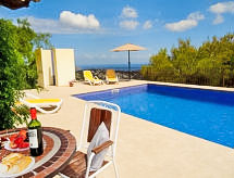 "Villa Osyris", 3 -sobna kuća 70 m2. Dnevni boravak/blagovaona 25 m2 s TV-om sa sat. prijemnikom i digitalnim TV. Izlaz na lođu. 1 soba s 2 kreveta. 1 soba s 1 franc. krevetom. Kuhinja (pećnica, perilica za suđe, 4 staklokeramičke ploče za kuhanje, toster, kuhalo za vodu, mikrovalna pećnica, el. aparat za kavu). Tuš/WC. Garnitura za sjedenje, ležaljke. Prekrasan pogled na more i krajolik. Na raspolaganju: perilica za rublje. Internet (wireless LAN [WLAN], besplatan). Parking (2 automobila). AT-4168-A- postrojenja