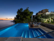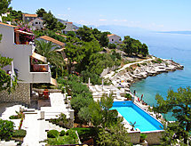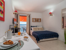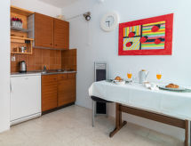 1 -sobni apartman 18 m2 na 1. katu. Studio s 1 franc. krevetom (140 cm, dužina 200 cm), TV-om sa sat. prijemnikom i klima uređajem. Otvorena kuhinja (2 ploče za kuhanje) s stolom za blagovanje. Tuš/bidet/WC. Terasa, prema jugu. Garnitura za sjedenje. Prekrasan panoramski pogled na more i bazen. Na raspolaganju: sušilo za kosu. Internet (wireless LAN [WLAN], besplatan).- postrojenja