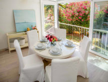 "Villa Polonia Mouche", 4 -sobna kuća 150 m2. Prostrano i svijetlo, vrlo lijepo i stilski uređena: dnevni boravak s klima uređajem i grijanjem na topli zrak. Izlaz na terasu. Blagovaona s stolom za blagovanje, klima uređajem i grijanjem na topli zrak. 1 soba s 1 franc. krevetom (180 cm, dužina 200 cm), kadom/bidetom/WC-om, duplim umivaonikom, klima uređajem i grijanjem na topli zrak. 1 soba s 1 franc. krevetom (140 cm, dužina 190 cm), tušem/WC-om, klima uređajem i grijanjem na topli zrak. Otvorena kuhinja (pećnica, perilica za suđe, 5 Indukcione ploče, toster, kuhalo za vodu, mikrovalna pećnica, zamrzivač, el. aparat za kavu). Odv. WC. Velika terasa. Garnitura za sjedenje, vrtni roštilj, ležaljke (4), lođa. Vrlo lijep panoramski pogled na more, planine i dolinu. Na raspolaganju: perilica za rublje, sušilica, glačalo, sušilo za kosu. Internet (wireless LAN [WLAN], besplatan). Parking (2 automobila). Dodatna informacija: prikladno za obitelji. Kuća za nepušače. VT-472007-A- Značajke smještaja