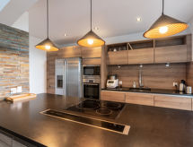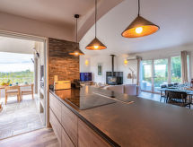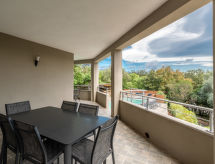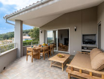 6 -sobna vila 230 m2 na 2 etaže. Prostrano, komforno i moderno uređena: veliki dnevni boravak/blagovaona s peći na drva. Izlaz na balkon. 1 soba s 1 franc. krevetom (160 cm, dužina 190 cm), tušem/WC-om i duplim umivaonikom. 1 soba s 1 franc. krevetom (160 cm, dužina 190 cm), kadom/WC-om i duplim umivaonikom. Izlaz na balkon. Otvorena kuhinja (4 Indukcione ploče, toster, kuhalo za vodu, mikrovalna pećnica, el. aparat za kavu, kuhinjski otok). Izlaz na balkon. Odv. WC. Donji kat: 1 soba s 1 franc. krevetom (160 cm, dužina 190 cm), tušem/WC-om i duplim umivaonikom. Izlaz na balkon. 1 soba s 1 franc. krevetom (160 cm, dužina 190 cm), tušem/WC-om i duplim umivaonikom. 1 velika soba s 1 kaučem za 2 osobe (140 cm, dužina 190 cm), kuhinjskim blokom. Izlaz na balkon. Odv. WC. 2 velika balkona, terasa. Garnitura za sjedenje, vrtni roštilj, ležaljke (10), mjesto za sjedenje. Lijep pogled na more i planine. Na raspolaganju: perilica za rublje, glačalo. Internet (wireless LAN [WLAN], besplatan). Dodatna informacija: apartman za nepušače. Protupožarni alarm.- Značajke smještaja