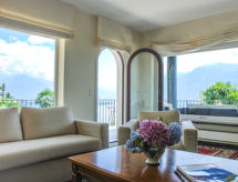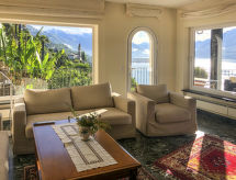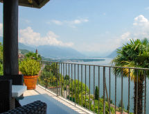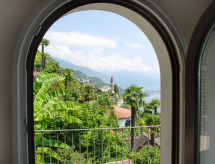 "Panorama Lakeview Lago Maggiore", 4 -sobna kuća 140 m2 na 2 etaže, prema jugu. Prostrano i svijetlo, komforno i lijepo uređena: 1 otvorena velika soba s 2 kreveta (90 cm, dužina 200 cm), 1 kaučem za 1 osobu (130 cm, dužina 180 cm). Izlaz u vrt. Blagovaona. Kuhinja (pećnica, perilica za suđe, 4 staklokeramičke ploče za kuhanje, toster, kuhalo za vodu, zamrzivač, el. aparat za kavu, Doze za mašinu za kavu (Nespresso) uz doplatu, raclette roštilj, set za fondue (sir)). Tuš/WC, odv. WC. El. grijanje. Gornji kat: otvorena velika dnevno-spavaća soba s panoramskim prozorom s 1 kaučem za 1 osobu (160 cm, dužina 200 cm), kabelskom TV i međunarodnim TV kanalima (plosnatim TV ekranom), radiom. Izlaz na balkon. 1 bračna soba s 1 bračnim krevetom (1 x 160 cm, dužina 200 cm), kadom/WC-om. Izlaz na balkon. 2 terase (djelomično natkrite), vrtna terasa (djelomično natkrita). Garnitura za sjedenje, balkonski namještaj, vrtni roštilj (prijenosni), ležaljke (4). Prekrasan panoramski pogled na jezero, planine, krajolik i mjesto. Na raspolaganju: glačalo, visoka dječja stolica, dječji krevetić do 2 godine (uz doplatu), sušilo za kosu. Internet (wireless LAN [WLAN], besplatan). Parking (natkrit) uz kuću. Dodatna informacija: kuća za nepušače.- Značajke smještaja