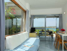 "Vista Playa 4", 2 -sobni apartman 40 m2, u prizemlju. Jednostavno uređen: dnevni boravak/blagovaona s 1 kaučem za 1 osobu, 1 krevetom na izvlačenje, TV-om sa sat. prijemnikom i klima uređajem. Izlaz na mjesto za sjedenje u vrtu. 1 bračna soba s tušem/bidetom/WC-om i bojlerom (10 litara). Kuhinjska niša (4 ploče za kuhanje, zamrzivač). Vrtna terasa 10 m2. Garnitura za sjedenje. Pogled na more. Na raspolaganju: perilica za rublje. 1 kućni ljubimac / pas dozvoljen. IUN:Q3443- postrojenja