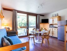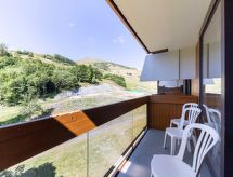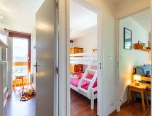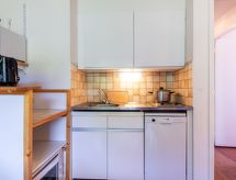 3 -sobni apartman 40 m2 na 7. katu, prema jugoistoku. Svrsishodno i lijepo uređen: dnevni boravak/blagovaona s 1 krevetom na izvlačenje (2 osobe 2 x 80 cm, dužina 190 cm), TV-om (plosnatim TV ekranom). Izlaz na balkon, prema jugu. 1 soba s 1 franc. krevetom (140 cm, dužina 190 cm). Izlaz na balkon, prema istoku. 1 soba s 1 x 2 kreveta na kat (80 cm, dužina 190 cm). Izlaz na balkon, prema istoku. Kuhinjska niša (2 ploče za kuhanje, pećnica, perilica za suđe, toster, kuhalo za vodu, mikrovalna pećnica, zamrzivač, el. aparat za kavu). Kada, odv. WC. El. grijanje. Parketni pod. 2 balkona 4 m2, prema jugu i prema istoku. Balkonski namještaj, ležaljke (2). Pogled na skijašku stazu. Na raspolaganju: glačalo, sušilo za kosu. Internet (wireless LAN [WLAN], uz doplatu). Dodatna informacija: najviše 1 kućni ljubimac / pas dozvoljen. Protupožarni alarm.- postrojenja