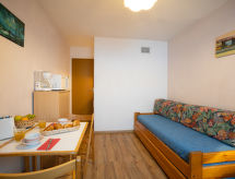 1 -sobni studio 16 m2 na 13. katu, prema sjeveru. Jednostavno i svrsishodno uređen: dnevni boravak/blagovaona s 1 krevetom na izvlačenje (2 osobe 2 x 80 cm, dužina 190 cm), TV-om (plosnatim TV ekranom). Kuhinjska niša (2 ploče za kuhanje, toster, mikrovalna pećnica, el. aparat za kavu). Kada/WC. El. grijanje. Parketni pod. Pogled na dolinu. Na raspolaganju: Internet (wireless LAN [WLAN], uz doplatu). Dodatna informacija: najviše 1 kućni ljubimac / pas dozvoljen. Protupožarni alarm.- postrojenja