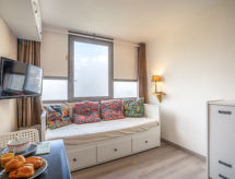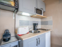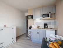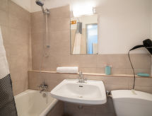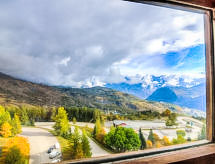 1 -sobni studio 16 m2 na 13. katu, prema sjeveru. Komforno i lijepo uređen: dnevni boravak/blagovaona s 1 kaučem za 2 osobe (2 x 80 cm, dužina 200 cm), TV-om (plosnatim TV ekranom). Kuhinjska niša (2 ploče za kuhanje, mini pećnica, toster, kuhalo za vodu, mikrovalna pećnica, el. aparat za kavu, Doze za mašinu za kavu (Nespresso) uz doplatu, raclette roštilj, set za fondue (sir)). Kada/WC. El. grijanje. Parketni pod. Lijep pogled na dolinu. Na raspolaganju: glačalo, sušilo za kosu. Internet (wireless LAN [WLAN], uz doplatu). Dodatna informacija: apartman za nepušače. Protupožarni alarm.- postrojenja