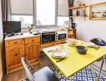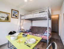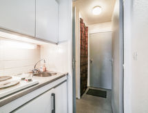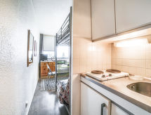 1 -sobni studio 16 m2 na 3. katu, prema sjeveru. Svrsishodno uređen: dnevni boravak/blagovaona s 1 kaučem za 2 osobe (130 cm, dužina 190 cm), TV-om (plosnatim TV ekranom), muzičkom linijom. Kuhinjska niša u predsoblju (2 ploče za kuhanje, pećnica, toster, kuhalo za vodu, mikrovalna pećnica, el. aparat za kavu, raclette roštilj). Kada/WC. El. grijanje. Parketni pod. Prema sjeveru. Pogled na dolinu. Na raspolaganju: glačalo, sušilo za kosu. Internet (wireless LAN [WLAN], uz doplatu). Dodatna informacija: apartman za nepušače. 1 kućni ljubimac / pas dozvoljen. Protupožarni alarm.- postrojenja