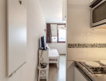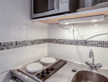 1 -sobni studio 16 m2 na 11. katu, prema sjeveru. Svrsishodno uređen: dnevni boravak/blagovaona s 1 krevetom na izvlačenje (2 osobe 2 x 80 cm, dužina 190 cm), TV-om. Kuhinjska niša (2 ploče za kuhanje, mikrovalna pećnica, el. aparat za kavu). Kada/WC. El. grijanje. Parketni pod. Pogled na dolinu. Na raspolaganju: Internet (wireless LAN [WLAN], uz doplatu). Dodatna informacija: apartman za nepušače. Protupožarni alarm.- postrojenja