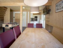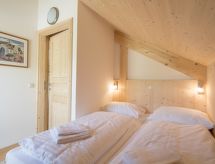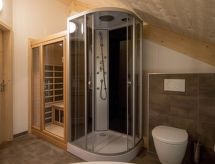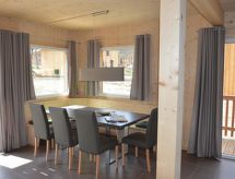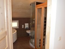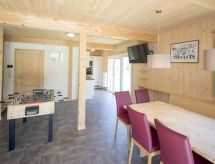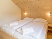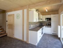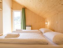 "Wellness 8P/4SZ", 5 -sobni chalet 100 m2 na 2 etaže. Svijetlo, komforno i s puno drva uređen: predsoblje. Dnevni boravak/blagovaona s stolom za blagovanje i TV-om sa sat. prijemnikom (plosnatim TV ekranom). 2 bračne sobe. 1 soba s 1 krevetom i 1 x 2 kreveta na kat. 1 soba s 1 krevetom. Otvorena kuhinja (pećnica, perilica za suđe, 4 staklokeramičke ploče za kuhanje, el. aparat za kavu, kombinirana mikrovalna pećnica). 2 x kada, odv. WC, hidromasažnom kadom. Komforno uređeno u ladanjskom stilu. Balkon, terasa. Vrlo lijep pogled na planine, skijašku stazu i krajolik. Na raspolaganju: sauna. Internet (wireless LAN [WLAN], besplatan). Dodatna informacija: kuća za nepušače. Protupožarni alarm, vatrogasni aparat.- postrojenja
