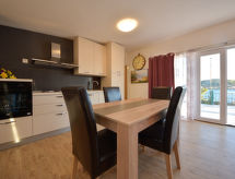 2 -sobna kuća 38 m2, prema sjeveru. Dnevni boravak/blagovaona 20 m2 s 1 kaučem za 2 osobe (140 cm, dužina 200 cm), TV-om sa sat. prijemnikom (plosnatim TV ekranom), klima uređajem. Izlaz na terasu. 1 soba s 1 franc. krevetom (160 cm, dužina 200 cm). Izlaz na terasu. Otvorena kuhinja (4 ploče za kuhanje, pećnica, zamrzivač, el. aparat za kavu). Tuš/WC. Klima uređaj (uz doplatu). Terasa 40 m2. Garnitura za sjedenje. Pogled na more. Na raspolaganju: Internet (wireless LAN [WLAN], besplatan).- postrojenja