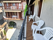Apt. di 3 locali 50 m2 al 2. piano. In parte restaurato nel 2018, arredamento funzionale: soggiorno/sala da pranzo con TV (satellite). 1 camera matrimoniale. Uscita sul balcone. 1 camera con 2 letti. Angolo cottura (4 punti cottura, forno a microonde, congelatore, macchina da caffè elettrica). Doccia/bidè/WC. Nessun riscaldamento. Balcone 8 m2. Mobili da balcone. Vista panoramica sul lago e sulle montagne. A disposizione: seggiolone, lettino per bimbi fino 2 anni. Internet (wifi, extra). Massimo 1 animale/cane consentito. CIR:017185-CNI-00067- Strutture