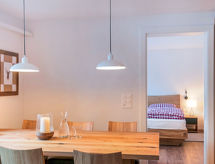 Apt. di 4 locali 100 m2 al 2. piano, esposizione sud. Arredamento moderno e accogliente: soggiorno/sala da pranzo con TV (via cavo) (schermo piatto). Uscita sul balcone, esposizione sud. 1 camera matrimoniale con (90 cm, lunghezza 200 cm), doccia/WC e TV (via cavo) (schermo piatto). Uscita sul balcone, esposizione sud. 1 camera 6 m2 con 1 x 2 letti a castello (80 cm, lunghezza 200 cm). 1 camera matrimoniale con (90 cm, lunghezza 200 cm), TV (via cavo) (schermo piatto). Cucina aperta (forno, lavastoviglie, 4 piastre cottura in vetroceramica, tostapane, bollitore elettrico, forno a microonde, macchina da caffè elettrica, capsule per la macchina da caffè (Nespresso) extra, set per raclette, set per fondue (formaggio)). Bagno/WC. Pavimenti in parquet. Magnifica vista sulle montagne. A disposizione: seggiolone, asciugacapelli. Internet (wifi, gratis). Parcheggio (2 Auto) vicino alla casa. Prego notare: adatto alle famiglie. Appartamento per non fumatori. Estintore, no ascensore.- Le caratteristiche dell'alloggio