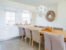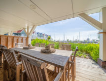 "Markermeer 8", apt. di 5 locali 126 m2 su 3 piani. Arredamento confortevole: ingresso con WC separato. Uscita sulla terrazza. 2 camere matrimoniali, ogni camera con 2 letti. Riscaldamento. Piano superiore: soggiorno con tv digitale. Uscita sul balcone. Cucina aperta (4 punti cottura, lavastoviglie, macchina da caffè elettrica, microonde combinato) con tavolo da pranzo. 2. piano superiore: 2 camere matrimoniali mansardate, ogni camera con 2 letti. 2 bagni o docce/WC. Balcone, terrazza. Mobili da terrazza. Vista sul porto. A disposizione: Internet (wifi, gratis). Parcheggio (2 Auto) vicino alla casa. Prego notare: casa per non fumatori. Allarme antifumo.- Le caratteristiche dell'alloggio