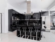 "Gem", villa 5 locali 250 m2 su 3 piani. Spazioso e luminoso, arredamento gradevole e moderno: soggiorno/camera aperto con 1 divano letto doppio, camino, tavolo da pranzo e TV (satellite) (schermo piatto). Uscita sul giardino, sulla piscina. 1 camera matrimoniale con 2 letti e doccia/WC. Cucina aperta (forno, lavastoviglie, 4 piastre cottura in vetroceramica, tostapane, bollitore elettrico, forno a microonde, macchina da caffè elettrica) con piccolo tavolo da pranzo. Climatizzazione. Piano superiore: (scala senza ringhiera) 1 camera matrimoniale con 1 letto doppio, bagno/WC e TV (satellite) (schermo piatto). Uscita sul balcone. 1 camera matrimoniale con 1 x 2 letti a castello, doccia/WC e TV (satellite) (schermo piatto). Uscita sul balcone. Climatizzazione. 2. piano superiore: (scala senza ringhiera) 1 camera matrimoniale con 1 letto doppio, bagno/WC e TV (satellite) (schermo piatto). Uscita sul balcone. Climatizzazione. Grande balcone, 2 piccoli balconi, grande posto a sedere all’aperto in parte coperto. Barbecue. Bella vista sul mare e sul paesaggio. A disposizione: lavatrice, ferro da stiro, asciugacapelli. Internet (wifi, gratis).- Attività nelle vicinanze
