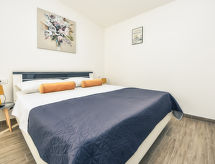Casa 3 locali 85 m2 su 2 piani, esposizione sud-ovest. Soggiorno/camera con 1 letto matrimoniale (155 cm, lunghezza 200 cm), tavolo da pranzo, angolo cucina e TV (satellite) (schermo piatto), climatizzazione. 1 camera con 1 letto matrimoniale (160 cm, lunghezza 200 cm), TV (satellite). Cucina (4 punti cottura, congelatore) con tavolo da pranzo e climatizzazione. Uscita sulla terrazza. 2 doccia/WC. Piano superiore: 1 camera con 1 letto matrimoniale (160 cm, lunghezza 200 cm), TV. Doccia/WC. Terrazza 15 m2, coperta. Mobili da terrazza, sedie a sdraio. Vista sulla piscina. A disposizione: asciugacapelli. Internet (wifi, gratis).- Strutture