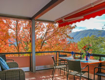 "App. 408", apt. di 3 locali 78 m2 al 4. piano, esposizione sud-ovest. Oggetto adatto a 2 adulti + 3 bambini. Spazioso e luminoso, arredamento moderno e di buon gusto: soggiorno/sala da pranzo aperto con finestra panoramica con tavolo da pranzo, TV (via cavo), schermo piatto, radio, CD, impianto stereo, climatizzazione e tapparelle elettriche. Uscita sul balcone. 1 camera matrimoniale con 1 letto doppio (2 x 90 cm, lunghezza 200 cm). Uscita sul balcone. 1 camera con 1 letto (90 cm, lunghezza 190 cm), 1 x 2 letti a castello (90 cm, lunghezza 200 cm). Uscita sul balcone. Cucina aperta (forno, lavastoviglie, 2 piastre cottura in vetroceramica, tostapane, bollitore elettrico, forno a microonde, macchina da caffè elettrica, capsule per la macchina da caffè (Dolce Gusto) extra, set per raclette, set per fondue (formaggio)). Bagno, WC separato. Riscaldamento. Grande balcone 12 m2, esposizione ovest e esposizione sud. Mobili da balcone, sedie a sdraio (1). Magnifica vista panoramica sul lago, sulle montagne, sulla piscina, sul paesaggio e sulla città. A disposizione: lavatrice (extra). Seggiolone, lettino per bimbi fino 2 anni (extra), asciugacapelli. Internet (wifi, gratis). Parcheggio vicino alla casa. Prego notare: appartamento per non fumatori. Allarme antifumo, estintore.- Strutture