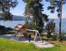 Apt. di 2 locali 52 m2 al 1. piano. Arredamento confortevole e accogliente: soggiorno con 1 divano letto doppio. 1 camera con 1 letto doppio. Angolo cottura (4 punti cottura, forno, lavastoviglie, bollitore elettrico, forno a microonde, macchina da caffè elettrica) con tavolo da pranzo, TV (satellite). Doccia/WC. Riscaldamento a pavimento. Balcone. Mobili da terrazza. Parziale vista sul lago. A disposizione: Internet (wifi, gratis). 1 animale/cane consentito.- Strutture