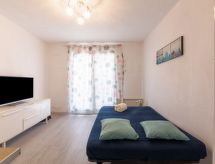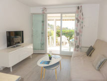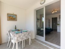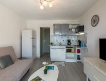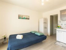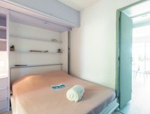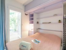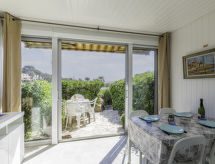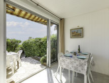 Apt. di 2 locali 26 m2, al pianterreno. Arredamento gradevole: soggiorno con 1 divano letto doppio (1 x 140 cm, lunghezza 190 cm), TV (schermo piatto). Uscita sulla veranda. Sala da pranzo. Uscita sulla terrazza. 1 camera con 1 letto doppio ad armadio (1 x 140 cm, lunghezza 190 cm). Angolo cottura (mini-forno, 2 piastre cottura in vetroceramica, tostapane, bollitore elettrico, forno a microonde, congelatore, macchina da caffè elettrica, capsule per la macchina da caffè (SENSEO) extra). Doccia, WC separato. Riscaldamento elettrico. Piccolo posto a sedere all’aperto 5 m2, esposizione sud. Mobili da terrazza. Splendida vista sul mare. A disposizione: ferro da stiro, asciugacapelli. Internet (wifi, extra). Parcheggio nr. 53. Prego notare: adatto alle famiglie. 1 animale/cane di piccola taglia consentito. Canali TV soltanto in FR. Allarme antifumo.- Le caratteristiche dell'alloggio