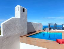 Attico di 3 locali 60 m2 al 2. piano, esposizione sud-est. Arredamento funzionale: soggiorno/sala da pranzo 20 m2, su 2 livelli con 1 divano letto, tv digitale e schermo piatto. 1 camera con 1 letto matrimoniale. 1 camera con 2 letti. Cucina (4 punti cottura, forno, lavastoviglie, forno a microonde) con passavivande. Bagno/bidè/WC. Riscaldamento elettrico. Terrazza 40 m2. Mobili da terrazza, barbecue, sedie a sdraio (4). Vista panoramica sul mare. A disposizione: lavatrice, asciugacapelli. Parcheggio (coperto). Ripostiglio per biciclette (2,50 mx 2,50 m). Piccola piscina privata per bambini (3m x 2m). HUTG003282- Strutture