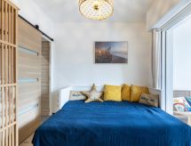 Apt. di 3 locali 48 m2 al 2. piano. Arredamento confortevole e gradevole: soggiorno/sala da pranzo con TV (schermo piatto). Uscita sulla terrazza. 1 camera con 1 letto matrimoniale (140 cm, lunghezza 190 cm). 1 camera con 1 letto estraibile (2 pers. 2 x 80 cm, lunghezza 190 cm). Cucina aperta (lavastoviglie, 3 piastre ad induzione, tostapane, bollitore elettrico, macchina da caffè elettrica, microonde combinato). Uscita sul balcone. Doccia, WC separato, lavabo doppio. Riscaldamento. Terrazza 15 m2, esposizione ovest. Mobili da terrazza. A disposizione: lavatrice, ferro da stiro. Internet (wifi, gratis). Prego notare: adatto alle famiglie. Appartamento per non fumatori. Allarme antifumo. 40304001057LJ- Le caratteristiche dell'alloggio
