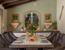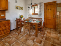 Casa di campagna "Palomas", molto grande, molto rustica, molto confortevole su 2 piani, circondata da alberi e campi. Unità composta da edificio principale e dependance, fuori dalla località, a 2 km dal centro di Pedreguer, posizione tranquilla, soleggiata, a 13 km dal mare. Per uso privato: terreno allo stato naturale, grande, bello, curato giardino terrazzato piante e alberi, frutteto, prato per sdraiarsi, biotopo, piscina ad angolo (12 x 6 m, profondità 110 - 180 cm, disponibilità stagionale: 01.Gen. - 31.Dic.) con scaletta. Doccia esterna, patio, pergola, mobili da giardino, barbecue, parcheggio nella proprietà. Negozio 1.8 km, supermercato 1.5 km, ristorante 450 m, panetteria 2.2 km, cafe 1 km. Prego notare: auto consigliata. Il proprietario non accetta gruppi di giovani.Interior