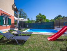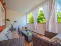 Apt. di 3 locali 68 m2, al pianterreno. Soggiorno/sala da pranzo 34 m2 con 1 divano letto e TV (satellite) (schermo piatto), climatizzazione. Uscita sulla terrazza. 1 camera 14 m2 con 2 letti (90 cm, lunghezza 200 cm). 1 camera 13 m2 con 1 letto doppio (2 x 90 cm, lunghezza 200 cm). Cucina aperta (4 punti cottura, forno, lavastoviglie, tostapane, forno a microonde, macchina da caffè elettrica). Doccia/bidè/WC. Terrazza 34 m2, coperta. Mobili da terrazza, sedie a sdraio. Vista sulla piscina e sul bosco. A disposizione: lavatrice, lettino per bimbi. Internet (wifi, gratis). Prego notare: ingresso privato.- Strutture