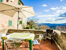 "Serena", apt. di 5 locali 150 m2 al 1. piano. Arredamento gradevole e antico: soggiorno/sala da pranzo grande. 3 camere matrimoniali. 1 camera con 1 letto. Cucina abitabile (4 punti cottura, forno, bollitore elettrico, forno a microonde, congelatore) con camino, TV (satellite) e video. Uscita sul balcone. Doccia/bidè/WC. Grande terrazza. Mobili da terrazza, barbecue. Vista panoramica sul paesaggio e sulla località. A disposizione: lavatrice, ferro da stiro, lettino per bimbi fino 3 anni. Internet (wifi). 1 animale/cane consentito.- Strutture