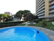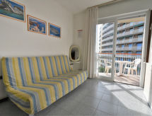Monolocale 30 m2 al 7. piano. Oggetto adatto a 2 adulti + 1 bambino. Luminoso, arredamento funzionale e confortevole: soggiorno/sala da pranzo con finestra panoramica con 1 letto, 1 divano letto doppio, tavolo da pranzo e TV (satellite) (schermo piatto). Uscita sulla terrazza. Angolo cottura (4 fuochi, forno a microonde, congelatore). Doccia/bidè/WC. Climatizzazione (extra), boiler. Grande terrazza. Mobili da terrazza. Vista panoramica sul mare e sulla cittadina. A disposizione: asciugacapelli. Prego notare: appartamento per non fumatori. 1 animale/cane consentito.- Strutture